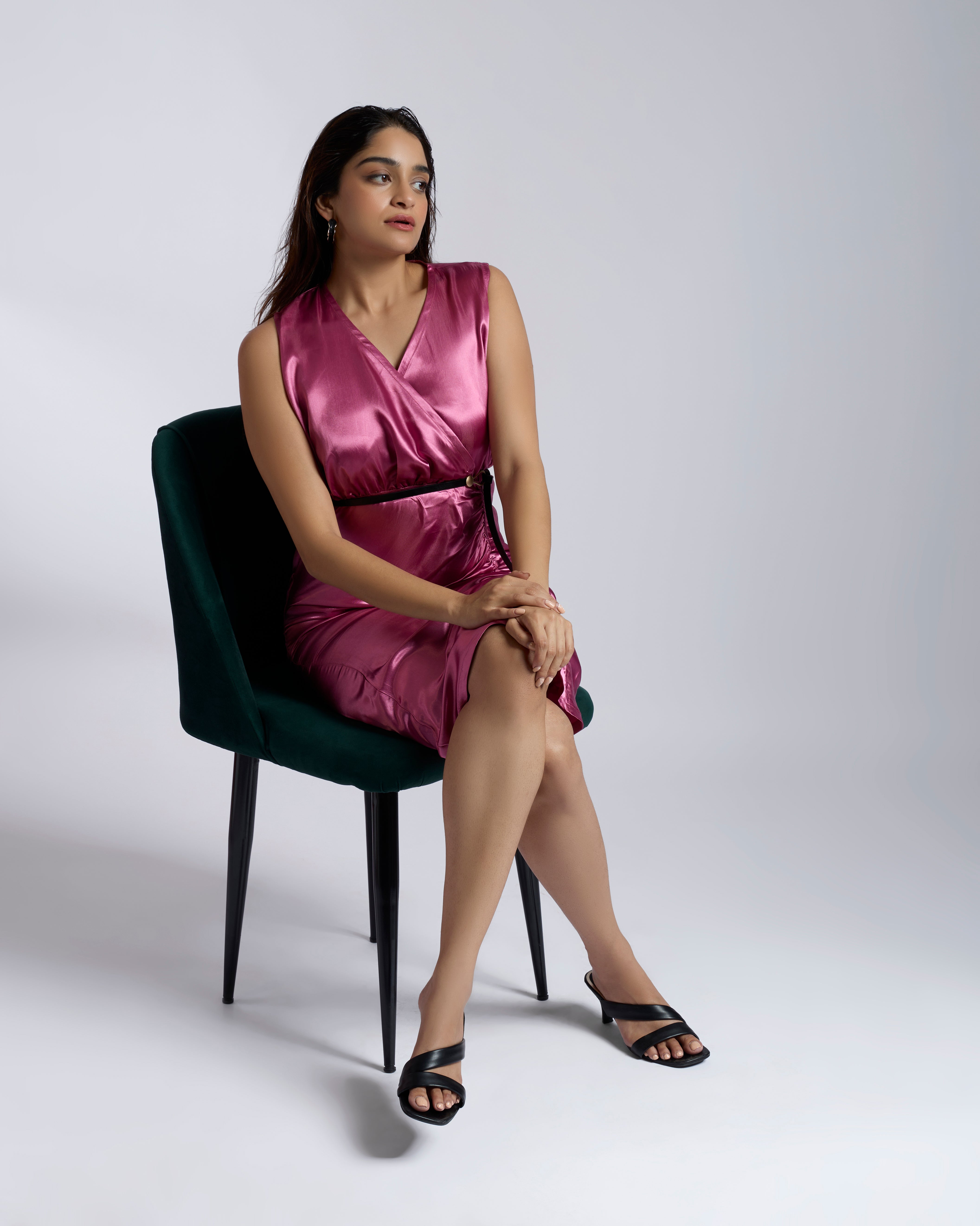 Look closely: Our designers set out to reimagine the metallic wrapdress for today, cut here with an overlap hem  detailing. With a gathered lengthened high slit, this wrap dress uses a japanese style satin fabric to ensure it transitions effortlessly from day to night.