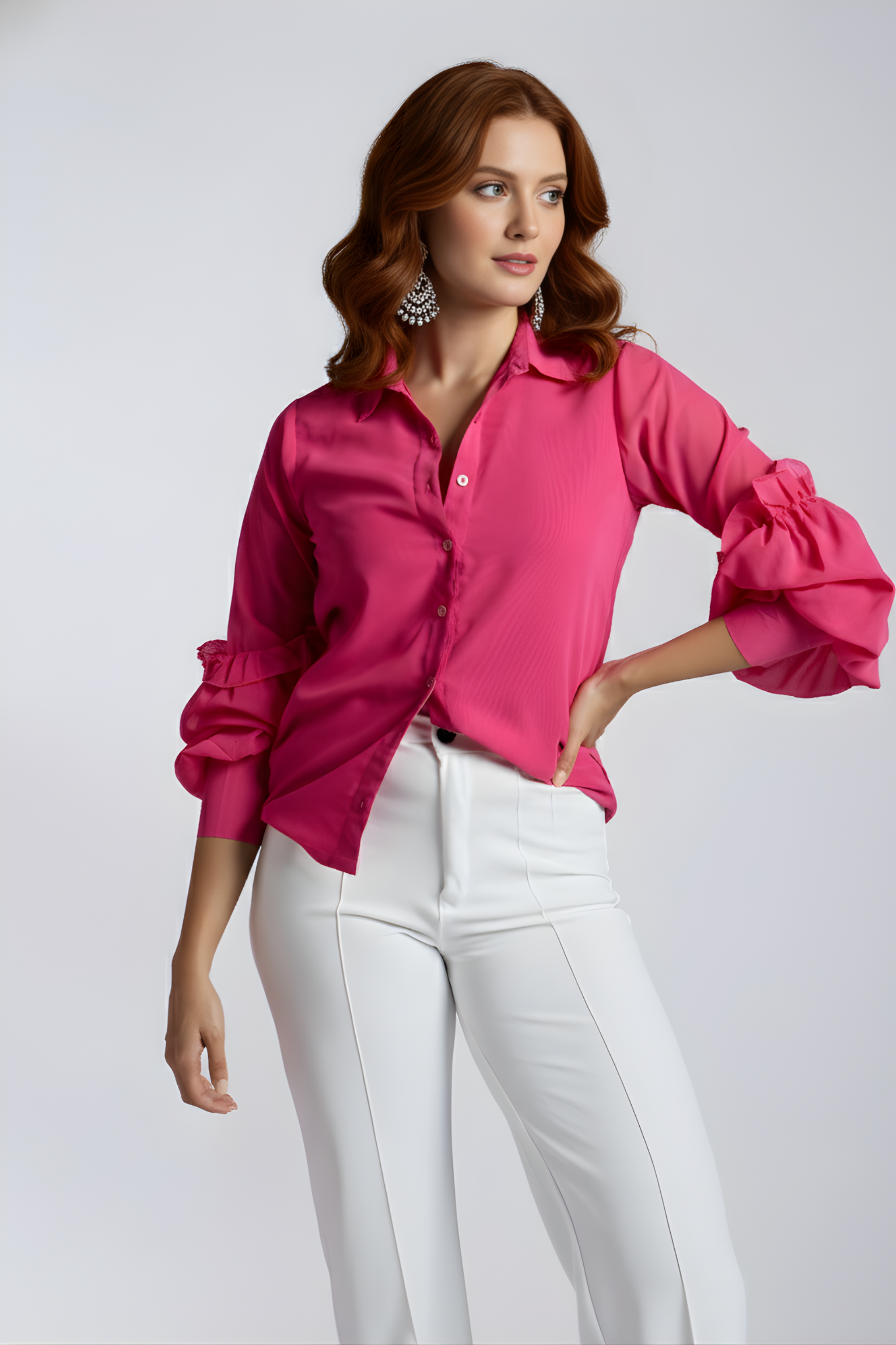 This top pairs well with any occasion. We used lush georgette and added a flat collar deep neckline and exaggerated long cuffed balloon sleeves.