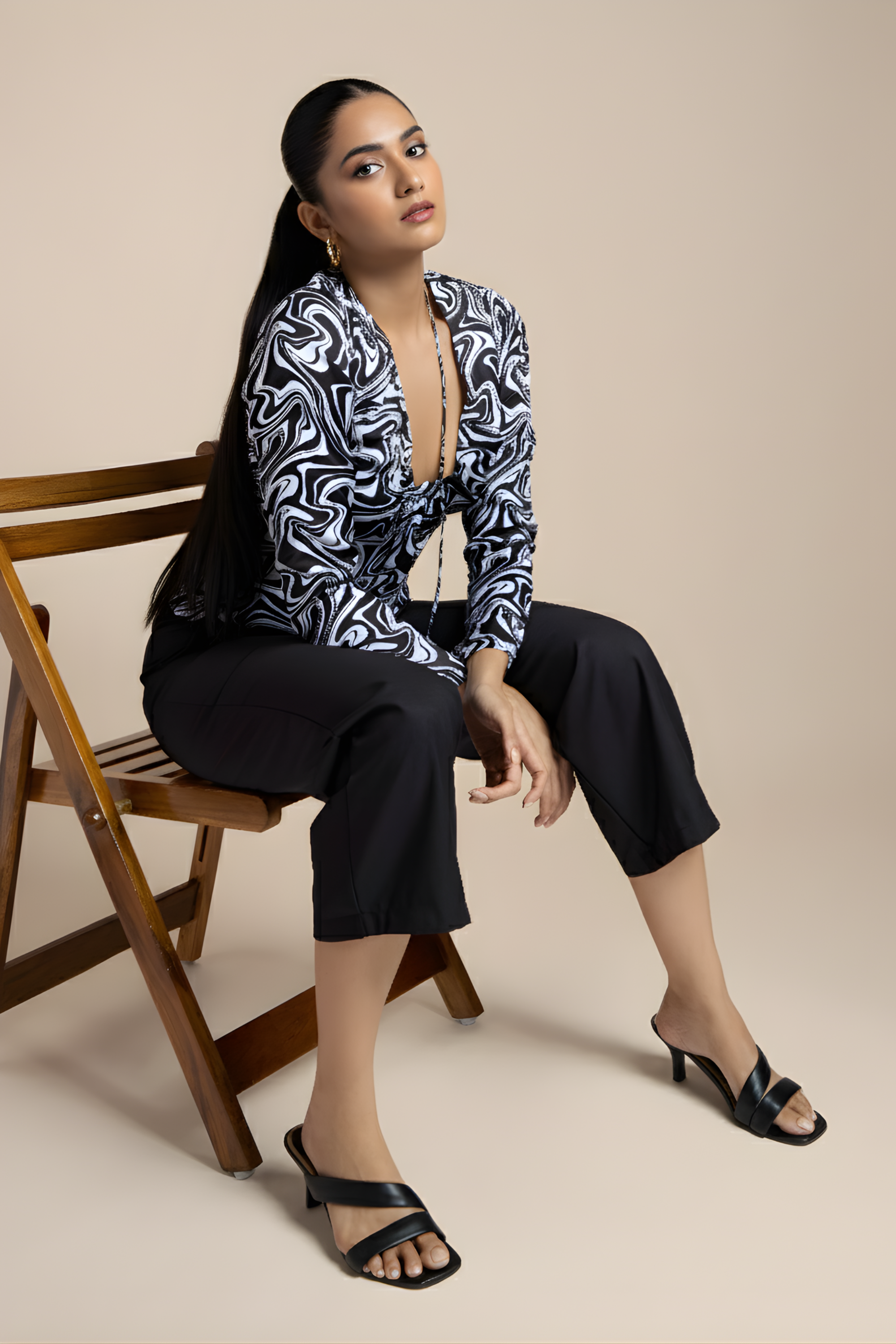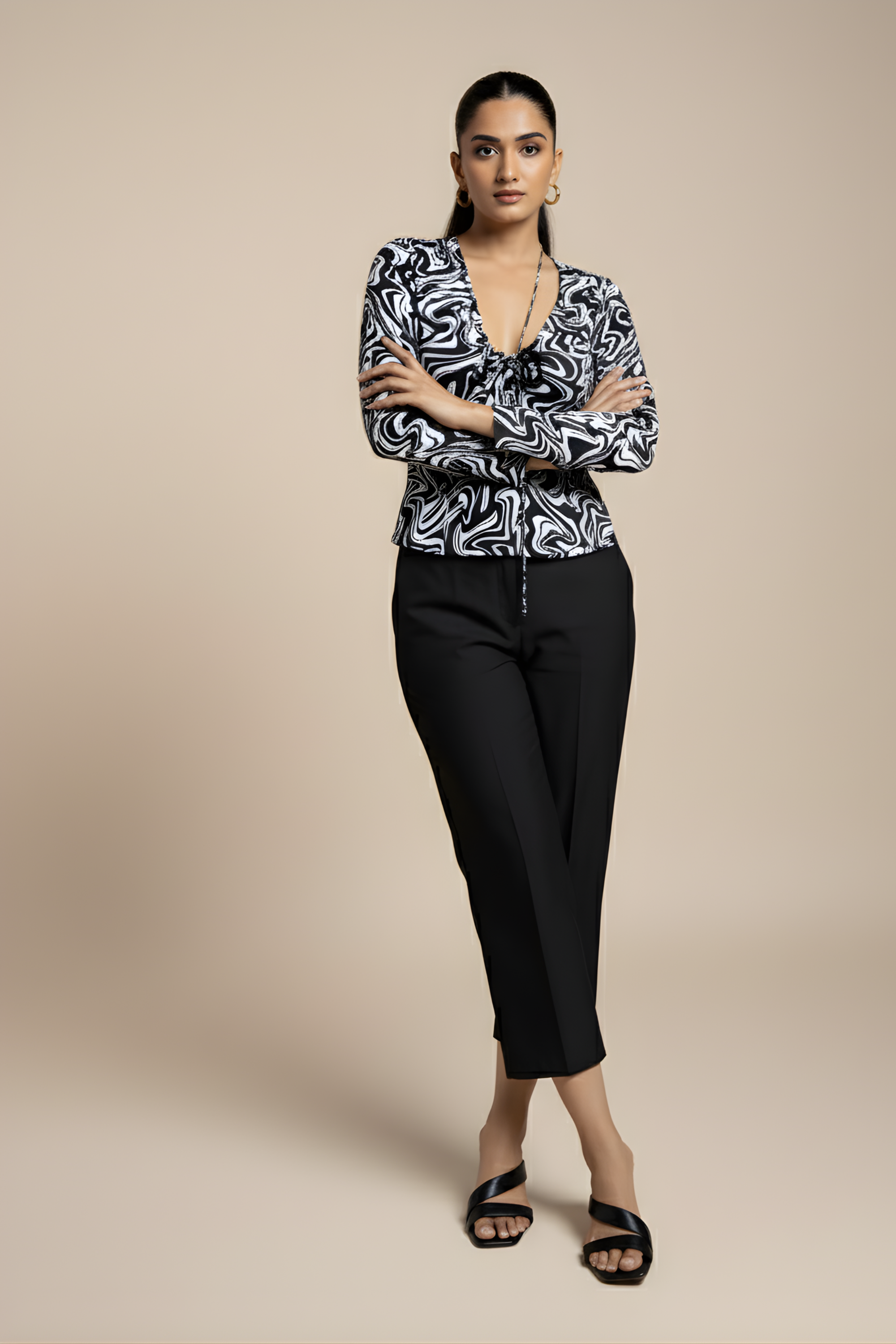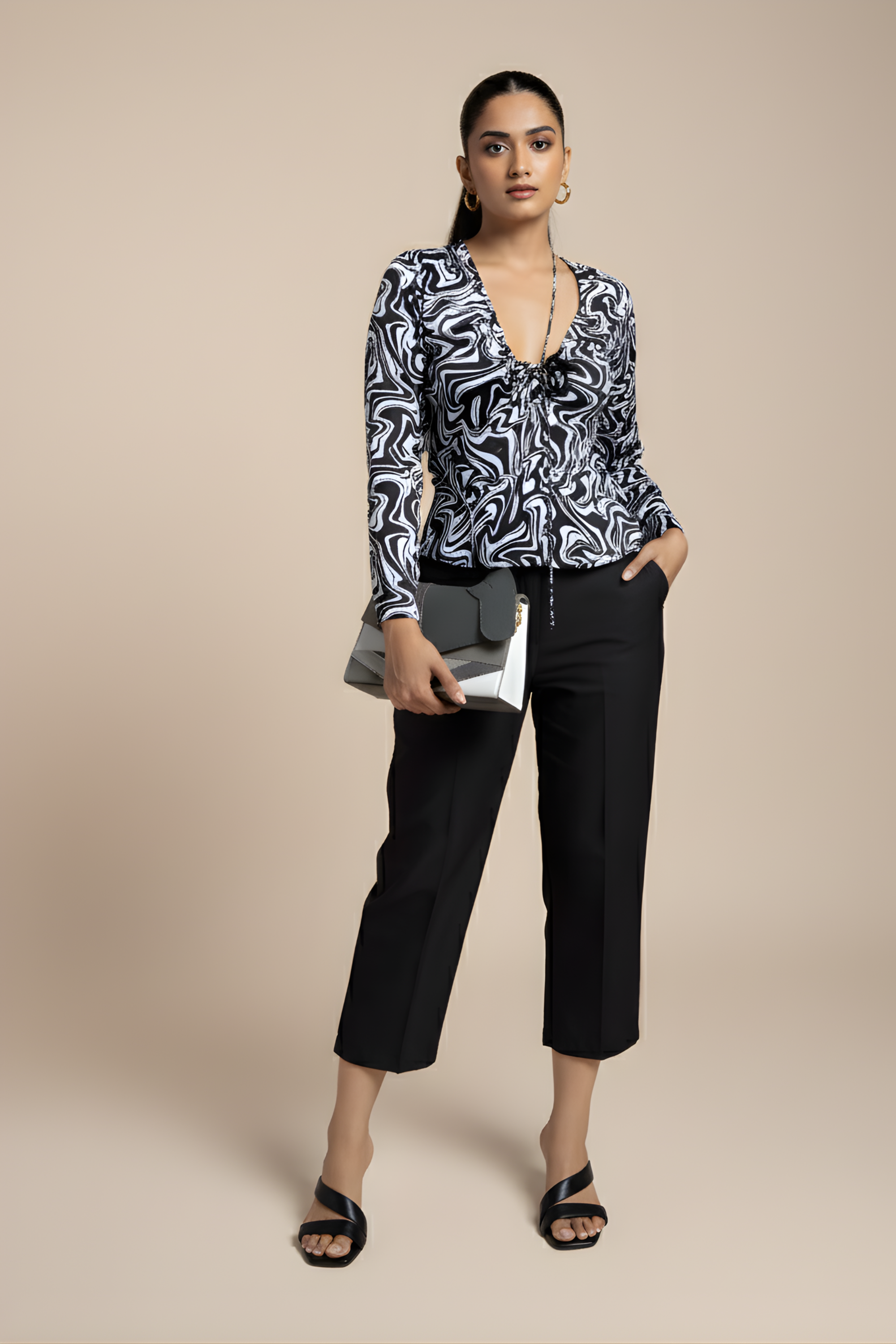 Our gathered shell top is cut from silky japan satin in a length ideal for pairing with flared or fitted trousers.